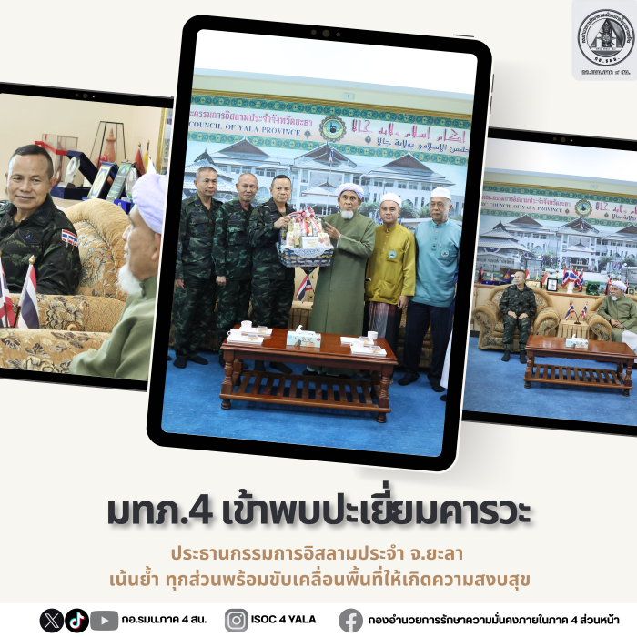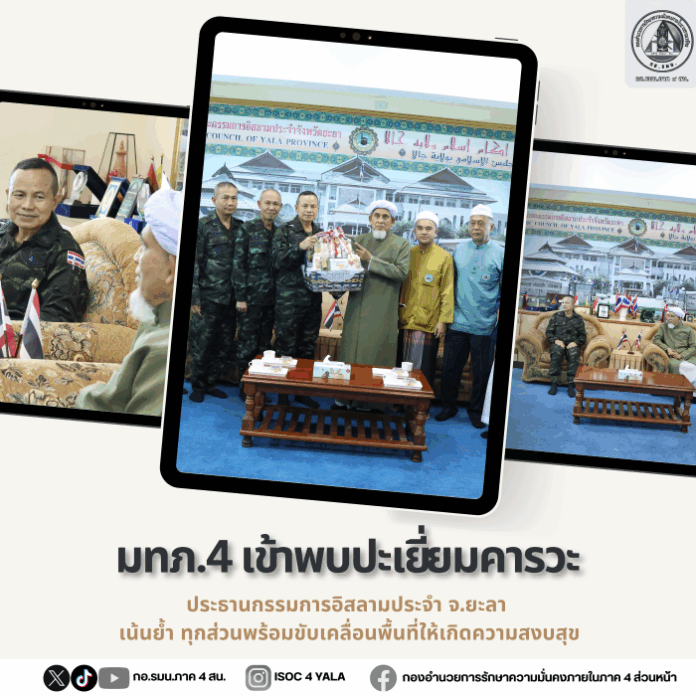 On 30 October 2025, at 2:30 p.m., at the Office of the Yala Provincial Islamic Committee, Mueang District, Yala Province, Lieutenant General Narathip Phoynok, Commander of the Fourth Army Region / Director of the Internal Security Operations Command Region 4 (ISOC Region 4), together with Major General Korakot Phuchot, Deputy Commander of the Fourth Army Region / Deputy Director of ISOC Region 4 Forward Command, and senior officers, paid a courtesy visit to Mr. Abdulbasi Chema, Chairman of the Yala Provincial Islamic Committee, and members of the Committee.