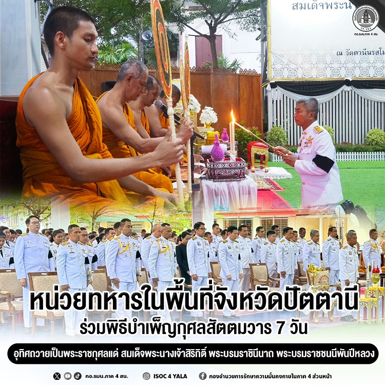 เมื่อวันที่ 30 ตุลาคม 2568 เวลา 17.00 น.จังหวัดปัตตานี จัดพิธีบำเพ็ญกุศลสัตตมวาร (ครบ 7 วัน) ณ วัดตานีนรสโมสร พระอารามหลวง อำเภอเมือง จังหวัดปัตตานี เพื่ออุทิศถวายเป็นพระราชกุศลแด่ สมเด็จพระนางเจ้าสิริกิติ์ พระบรมราชินีนาถ พระบรมราชชนนีพันปีหลวง โดยมี นายสนั่น สนธิเมือง รองผู้ว่าราชการจังหวัดปัตตานี เป็นประธานในพิธี พร้อมด้วย พันเอก สฐิรพงษ์ อาจหาญ เสนาธิการกองพลทหารราบที่ 15 , กำลังพลจากมณฑลทหารบกที่ 46 , หัวหน้าส่วนราชการ , หน่วยงานภาครัฐ , ภาคเอกชน , ข้าราชการ ทหาร ตำรวจ และประชาชนในพื้นที่เข้าร่วมพิธีบำเพ็ญกุศลสัตตมวารในครั้งนี้อย่างพร้อมเพรียง