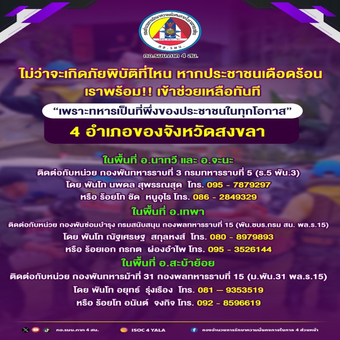 หากประชาชนในพื้นที่จังหวัดสงขลาได้รับความเดือดร้อนจากภัยพิบัติ หรือพบเห็นเหตุฉุกเฉิน สามารถแจ้งขอความช่วยเหลือได้โดยตรงกับศูนย์บรรเทาสาธารณภัยของหน่วยทหารในพื้นที่