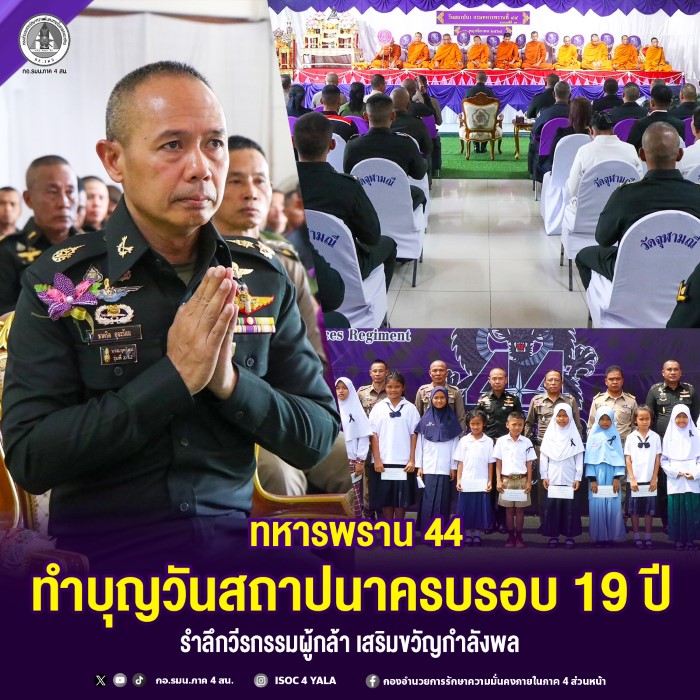 ทั้งนี้ กรมทหารพรานที่ 44 ก่อตั้งขึ้นเมื่อวันที่ 1 พฤศจิกายน พ.ศ. 2549 โดยมีภารกิจหลักในการป้องกันและรักษาความมั่นคงในพื้นที่จังหวัดชายแดนภาคใต้ พร้อมทั้งปฏิบัติภารกิจเฉพาะด้าน ด้านความมั่นคงของรัฐ ปกป้องประชาชนและอธิปไตยของชาติ หน่วยได้ชื่อว่าเป็นกำลังปฏิบัติการเชิงรุกที่มีความเชี่ยวชาญในงานทหารพราน การลาดตระเวน การข่าว และงานกิจการพลเรือน เพื่อสร้างความเข้าใจและความสัมพันธ์ที่ดีกับชุมชนในพื้นที่ ซึ่งพิธีทำบุญเนื่องในวันคล้ายวันสถาปนา กรมทหารพรานที่ 44 ครบรอบปีที่ 19 ที่จัดขึ้นในครั้งนี้ สะท้อนให้เห็นถึงความรัก ความสามัคคี และจิตสำนึกในการอุทิศตนเพื่อชาติของเหล่าทหารพราน กรมทหารพรานที่ 44 ที่ปฏิบัติภารกิจอย่างเข้มแข็งเพื่อความปลอดภัยของประชาชนในพื้นที่จังหวัดชายแดนภาคใต้