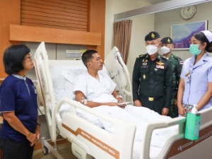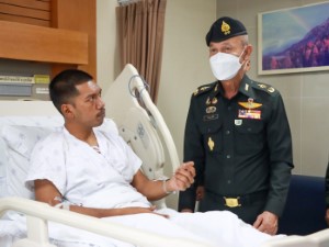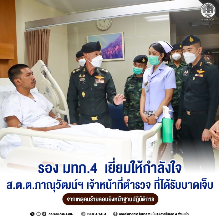 Today (1 November 2025) at Songklanagarind Hospital, Hat Yai District, Songkhla Province, Major General Korakot Phuchot, Deputy Commander of the 4th Army Region / Deputy Director of the Internal Security Operations Command Region 4 (Forward), together with his delegation, visited and offered moral support to Police Lance Corporal Phanuwat Thong-O, aged 29, an officer from the Special Operations Unit (NPP) Narathiwat 41, who was injured in a shooting attack by armed assailants while on duty in front of the Special Task Force Base, Narathiwat 41 (NPP Nara 41), Dusongyo Subdistrict, Chanae District, Narathiwat Province, on 29 October 2025.
