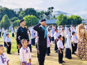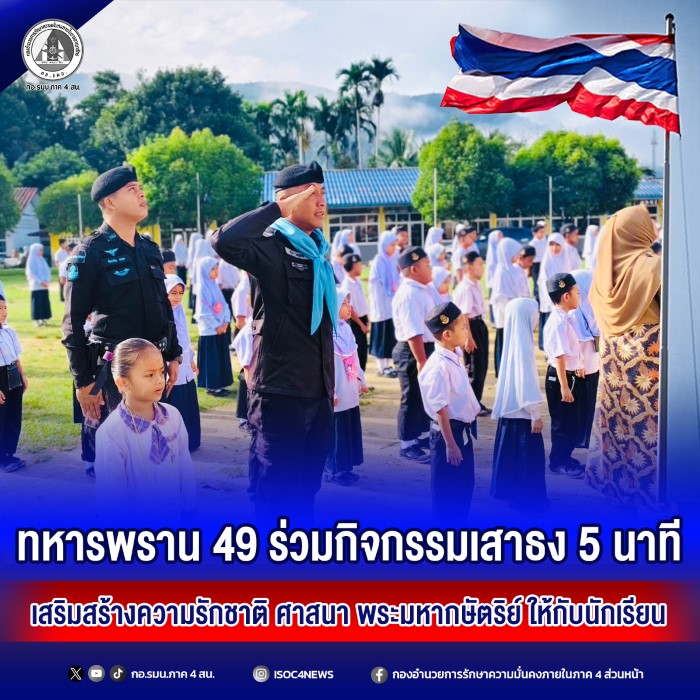 วันที่ 3 พฤศจิกายน 2568 เวลา 08.00 น. พันเอก ณัฏฐพล สุนทรนนท์ ผู้บังคับหน่วยเฉพาะกิจกรมทหารพรานที่ 49 มอบหมายให้ กองร้อยทหารพรานที่ 4912 นำโดย จ่าสิบเอก สุนัย ไพบูลย์ หัวหน้าส่วนการเมืองชุดปฏิบัติการกิจการพลเรือนที่ 4912 พร้อมด้วย กำลังพลชุดปฏิบัติการกิจการพลเรือน ร่วมทำกิจกรรมเสาธง 5 นาที นำนักเรียนร้องเพลงชาติ เชิญธงชาติขึ้นสู่ยอดเสา เพื่อปลุกจิตสำนึกให้เด็ก เยาวชน รู้คุณชาติ ศาสนา พระมหากษัตริย์ ปฏิบัติตนอยู่ในกรอบของกฎหมาย ยึดหลัก “ความสงบ และรู้ รัก สามัคคี” ตลอดจนปกป้องชาติ ศาสนา พระมหากษัตริย์ ให้สามสถาบันหลักของชาติเป็นศูนย์รวมจิตใจของปวงชนในชาติ และสามารถดำรงอยู่คู่กับประชาธิปไตยอย่างมั่นคงต่อไป พร้อมปลูกฝังอุดมการณ์ความรักชาติ และสร้างความรู้เรื่องโทษของยาเสพติด ทั้งนี้เพื่อเสริมสร้างความสัมพันธ์ที่ดีระหว่างเจ้าหน้าที่รัฐกับสถานศึกษา ณ โรงเรียนบ้านดาฮง หมู่ที่ 4 ตำบลเชิงคีรี อําเภอศรีสาคร จังหวัดนราธิวาส