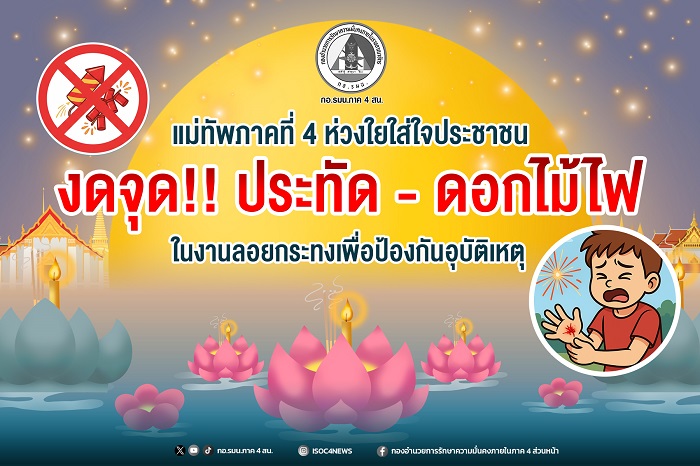 “…แม่ทัพภาคที่ 4 ห่วงความปลอดภัยประชาชนในห้วงเทศกาลวันลอยกระทง กำชับต้องไม่เกิดการสูญเสีย คุมเข้มเล่นประทัด-ดอกไม้ไฟงานลอยกระทง…”