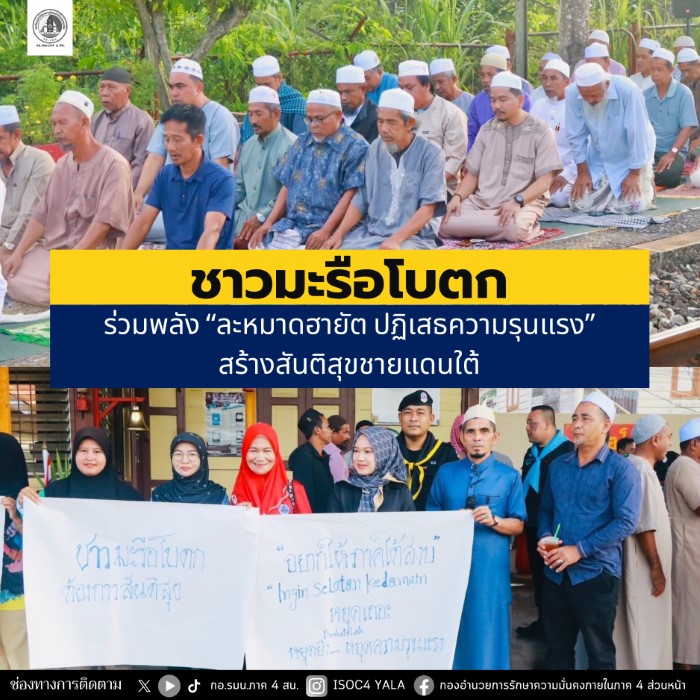 วันที่ 4 พฤศจิกายน 2568 เวลา 07.00 น. พันโท ไธพัตย์ สุนทรวิภาต รองผู้บังคับหน่วยเฉพาะกิจกรมทหารพรานที่ 45 ร่วมกับส่วนราชการ 3 ฝ่ายอำเภอระแงะ และพี่น้องประชาชนในพื้นที่ตำบลมะรือโบตก ร่วมประกอบพิธีละหมาดฮายัตและร่วมกิจกรรม “ปฏิเสธความรุนแรง” เพื่อแสดงเจตนารมณ์ในการต่อต้านการใช้ความรุนแรงทุกรูปแบบ