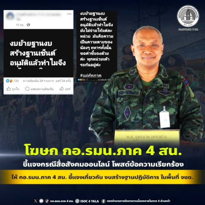 จากกรณีสื่อสังคมออนไลน์ โพสต์ข้อความเรียกร้องให้ กองอำนวยการรักษาความมั่นคงภายในภาค 4 ส่วนหน้า ชี้แจงเกี่ยวกับงบสร้างฐานปฏิบัติการ ในพื้นที่จังหวัดชายแดนภาคใต้