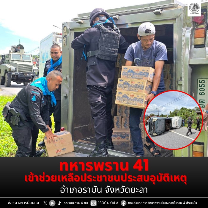 เมื่อวันที่ 4 พฤศจิกายน 2568 เวลา 10.50 น. หน่วยเฉพาะกิจกรมทหารพรานที่ 41 โดย ผู้บังคับกองร้อยทหารพรานที่ 4109 พร้อมกำลังพลชุดปฏิบัติการกิจการพลเรือน ได้ออกปฏิบัติภารกิจในพื้นที่ และระหว่างทางได้พบเหตุรถยนต์ประสบอุบัติเหตุ ยางแตกและพลิกคว่ำ บริเวณใกล้มัสยิดบ้านบาลูกา หมู่ที่ 3 ตำบลกาลูปัง อำเภอรามัน จังหวัดยะลา จากการตรวจสอบพบว่า รถคันดังกล่าวเป็นรถที่ใช้ในการขนส่งนมโรงเรียน เพื่อส่งมอบให้กับเด็กนักเรียนโรงเรียนบ้านรามัน โดยมี นายมาลีกี ฮาแว เป็นผู้ขับขี่ ได้รับบาดเจ็บจากเหตุการณ์ดังกล่าว