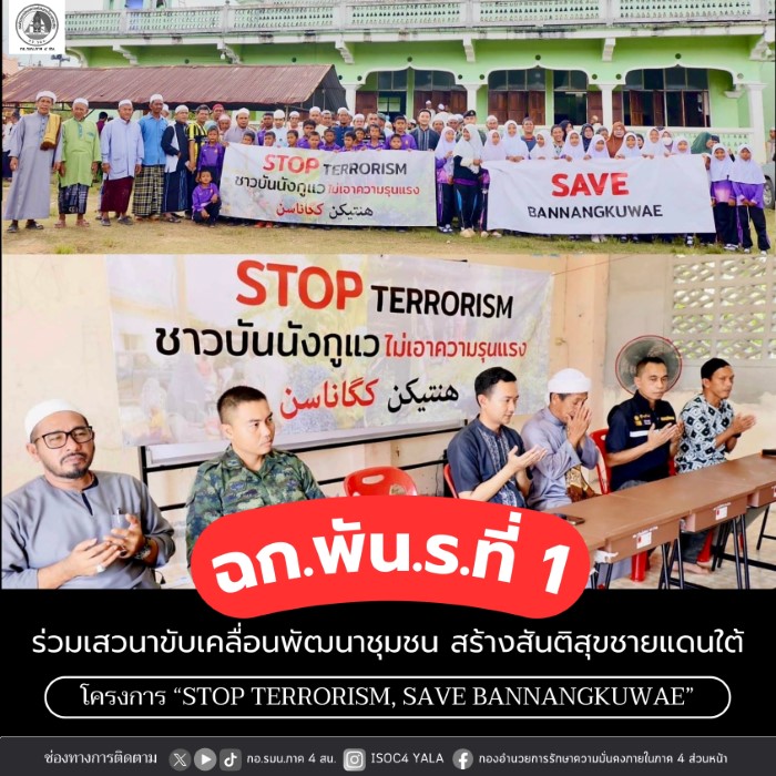 เมื่อวันที่ 4 พฤศจิกายน 2568 ณ มัสยิดอีบาดะห์ หมู่ที่ 4 บ้านบังนังกูแว ตำบลบันนังสตา อำเภอบันนังสตา จังหวัดยะลา หน่วยเฉพาะกิจ กองพันทหารราบที่ 1 (ฉก.พัน.ร.ที่ 1) โดย พันโท ภานุพงศ์ ชนะวรรณโณ รองผู้บังคับหน่วยเฉพาะกิจ กองพันทหารราบที่ 1 พร้อมกำลังพลของหน่วย เข้าร่วมการเสวนาในหัวข้อ “การขับเคลื่อนด้านการพัฒนาชุมชน และการวิเคราะห์ปัญหาข้อขัดข้องในพื้นที่” จัดขึ้น ภายใต้โครงการ “STOP TERRORISM, SAVE BANNANGKUWAE” เพื่อร่วมกันหาแนวทางพัฒนาพื้นที่ และสร้างความเข้าใจอันดีระหว่างภาครัฐ ผู้นำชุมชน ผู้นำศาสนา และพี่น้องประชาชนชาวไทยมุสลิมในพื้นที่