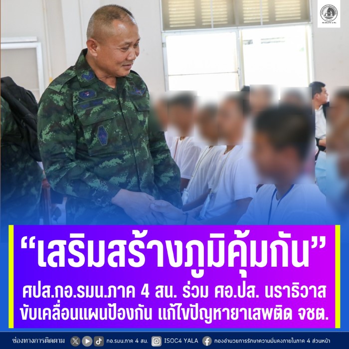 วันนี้ (5 พฤศจิกายน 2568) เวลา 10.00 น. ที่สถานฟื้นฟูสมรรถภาพพลเมือง กรมการปกครองจังหวัดนราธิวาส (บ้านนราภารดร) กองร้อยอาสารักษาดินแดนจังหวัดนราธิวาสที่ 1 ตำบลโคกเคียน อำเภอเมือง จังหวัดนราธิวาส พลตรี วิธเวช วิเศษศรี ผู้อำนวยการศูนย์ป้องกันและแก้ไขปัญหายาเสพติด กองอำนวยการรักษาความมั่นคงภายในภาค 4 ส่วนหน้า เป็นประธานการประชุมหารือ เพื่อขับเคลื่อนการดำเนินงานด้านการป้องกันและแก้ไขปัญหายาเสพติดในพื้นที่ ร่วมกับ ศูนย์อำนวยการป้องกันและแก้ไขปัญหายาเสพติดจังหวัดนราธิวาส โดยมี นายวิชาญ ชัยเศรษฐสัมพันธ์ รองผู้ว่าราชการจังหวัดนราธิวาส, ผู้แทนจากส่วนราชการทหาร ตำรวจ, หน่วยงานด้านสาธารณสุข ตลอดจนส่วนที่เกี่ยวข้อง เข้าร่วมประชุม