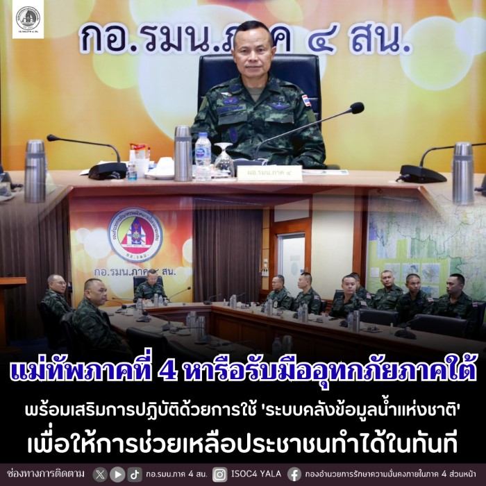 กองอำนวยการรักษาความมั่นคงภายในภาค 4 ส่วนหน้า ได้ตระหนักถึงความจำเป็นในการยกระดับการรับมือภัยพิบัติ จึงได้จัดให้มีการประชุมบูรณาการร่วมกับทุกภาคส่วน เพื่อวางแผนการปฏิบัติอย่างเป็นระบบในทุกมิติ ทั้งการป้องกันและเฝ้าระวัง การเตือนภัย และการช่วยเหลือผู้ประสบภัย โดยเน้นให้ความสำคัญกับพื้นที่เสี่ยงน้ำท่วมซ้ำซาก และการซักซ้อมแผนเผชิญเหตุอย่างต่อเนื่อง เพื่อให้ทุกหน่วยงานสามารถปฏิบัติงานร่วมกันได้อย่างรวดเร็วและมีประสิทธิภาพสูงสุดในการช่วยเหลือประชาชนให้พ้นจากสถานการณ์ภัยพิบัติ