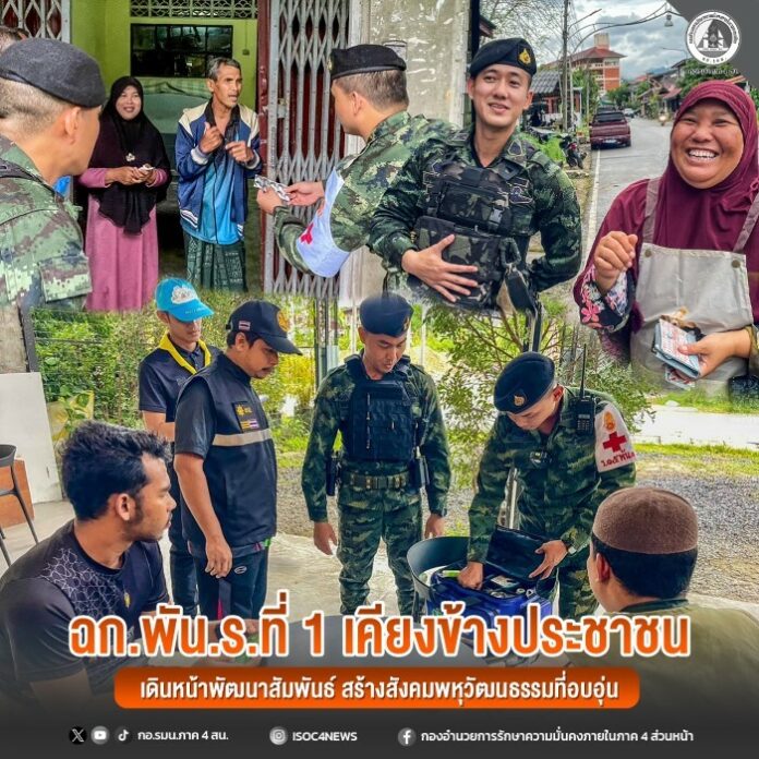 วันที่ 6 พฤศจิกายน 2568 พันเอก ชัยพิพัฒน์ อินทรเทพ ผู้บังคับหน่วยเฉพาะกิจกองพันทหารราบที่ 1 พร้อมกำลังพล ร่วมกับหน่วยเฉพาะกิจกรมทหารพรานที่ 33 เจ้าหน้าที่ตำรวจภูธรบันนังสตา และศูนย์ปฏิบัติการอำเภอบันนังสตา ลงพื้นที่พบปะพัฒนาสัมพันธ์กับพี่น้องประชาชนในพื้นที่ ตำบลบันนังสตา อำเภอบันนังสตา จังหวัดยะลา เพื่อมุ่งสร้างความเข้าใจและเสริมสร้างความมั่นคงในระดับพื้นที่ พร้อมสอบถามความเป็นอยู่และความต้องการของประชาชน เพื่อประสานความช่วยเหลือจากภาครัฐอย่างเหมาะสม ตามนโยบาย “การส่งเสริมการอยู่ร่วมกันภายใต้สังคมพหุวัฒนธรรมที่เข้มแข็ง”
