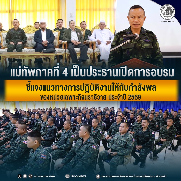 วันที่ 8 พฤศจิกายน 2568 เวลา 09.30 น. ณ สโมสรกรมทหารราบที่ 151 กองพลทหารราบที่ 5 ค่ายกัลยาณิวัฒนา จังหวัดนราธิวาส พลโท นรธิป โพยนอก แม่ทัพภาคที่ 4 / ผู้อำนวยการรักษาความมั่นคงภายในภาค 4 เป็นประธานเปิดการอบรมปฐมนิเทศกำลังพลของหน่วยเฉพาะกิจนราธิวาส ประจำปีงบประมาณ 2569 โดยมี นายอับดุลอาซิซ เจ๊ะมามะ รองประธานคณะกรรมการอิสลามประจำจังหวัดนราธิวาส ผู้นำศาสนาในพื้นที่ คณะผู้บังคับบัญชา และกำลังพลในสังกัดหน่วยเฉพาะกิจนราธิวาส เข้าร่วมการอบรมจำนวน 128 นาย