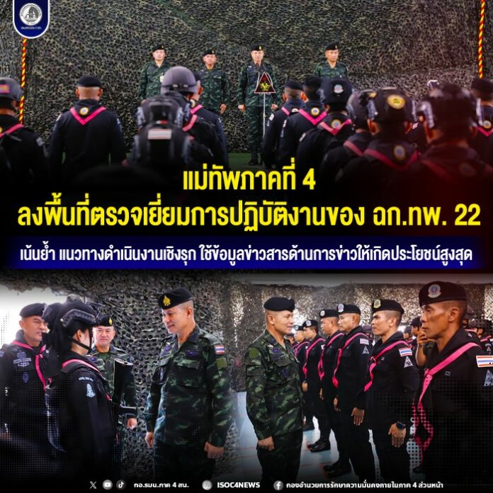 โอกาสนี้ พลโท นรธิป โพยนอก แม่ทัพภาคที่ 4/ผู้อำนวยการรักษาความมั่นคงภายในภาค 4 ได้กล่าวพบปะกำลังพล พร้อมเน้นย้ำถึงแนวทางปฏิบัติให้ทุกหน่วยดำเนินงานเชิงรุก ใช้ข้อมูลข่าวสารด้านการข่าวให้เกิดประโยชน์สูงสุด และบูรณาการร่วมกันระหว่างทหาร–ตำรวจ–ฝ่ายปกครอง เพื่อยกระดับความปลอดภัยและความเชื่อมั่นกับประชาชนในพื้นที่ รวมถึงต้องดูแลฐานปฏิบัติและหน่วยที่ตั้งให้มีความปลอดภัยสูงสุด และปฏิบัติงานโดยไม่ประมาท รอบคอบ วางแผน ซักซ้อม และปฏิบัติงานทั้งการตั้งจุด ตรวจจุดสกัดอย่างเป็นระบบ ยึดหลักกฎหมาย จริยธรรม ควบคู่กับการสื่อสารเชิงบวก เพื่อสร้างความเข้าใจที่ถูกต้องไปยังพี่น้องประชาชนในพื้นที่