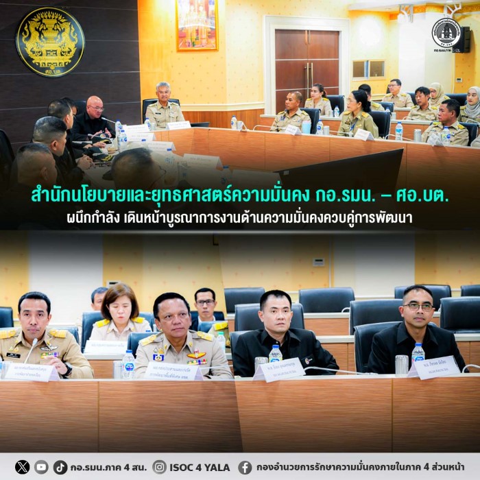วันนี้ (10 พฤศจิกายน 2568) เวลา 13.10 น. ที่ ห้องประชุมปัญจเพชร ศูนย์อำนวยการบริหารจังหวัดชายแดนภาคใต้ ตำบลสะเตง อำเภอเมือง จังหวัดยะลา พลโท จัตุรงค์ จันทรนนท์ ผู้อำนวยการสำนักนโยบายและยุทธศาสตร์ความมั่นคง กองอำนวยการรักษาความมั่นคงภายในราชอาณาจักรและคณะ ได้เดินทางพื้นที่ เพื่อร่วมประชุมหารือ และรับฟังการบรรยายสรุปการปฏิบัติงานในมิติการพัฒนาที่จังหวัดชายแดนภาคใต้ โดยมี ร้อยตำรวจเอก ปิยะ รักสกุล รองเลขาธิการ ศูนย์อำนวยการบริหารจังหวัดชายแดนภาคใต้ พร้อมส่วนราชการที่เกี่ยวข้อง ร่วมให้การต้อนรับและร่วมประชุม
