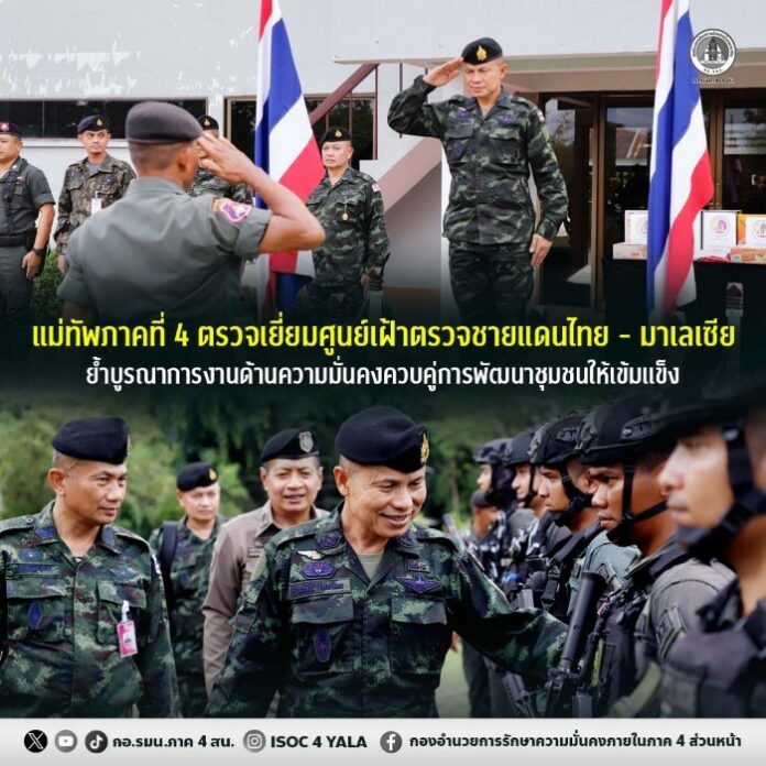 วันนี้ (9 พฤศจิกายน 2568) เวลา 15.00 น. พลโท นรธิป โพยนอก แม่ทัพภาคที่ 4 / ผู้อำนวยการรักษาความมั่นคงภายในภาค 4 พร้อมด้วย พลตรี กฤศ ศรีเดชาสินธุ์ รองผู้อำนวยการรักษาความมั่นคงภายในภาค 4 ส่วนหน้า พร้อมคณะฯ ลงพื้นที่ตรวจเยี่ยมการปฏิบัติงานของศูนย์เฝ้าตรวจชายแดนที่ 4401 และชุดตรวจเฝ้าชายแดนที่ 4405 สังกัดหน่วยเฉพาะกิจตำรวจตระเวนชายแดนที่ 44 เพื่อรับฟังบรรยายผลการปฏิบัติงาน และมอบนโยบาย 8 กิจสำคัญ เป็นกรอบแนวทางในการปฏิบัติภารกิจดูแลพื้นที่ชายแดนไทย – มาเลเซีย ในพื้นที่อำเภอเบตง จังหวัดยะลา