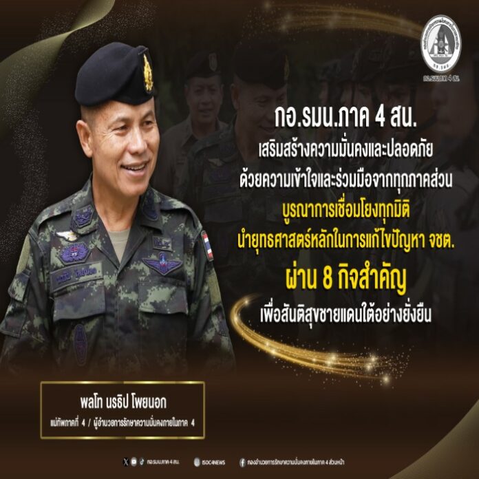 กอ.รมน.ภาค 4 สน. เสริมสร้างความมั่นคงและปลอดภัย ด้วยความเข้าใจและร่วมมือจากทุกภาคส่วน บูรณาการเชื่อมโยงทุกมิติ นำยุทธศาสตร์หลักในการแก้ไขปัญหา จชต. ผ่าน 8 กิจสำคัญ เพื่อสันติสุขชายแดนใต้อย่างยั่งยืน