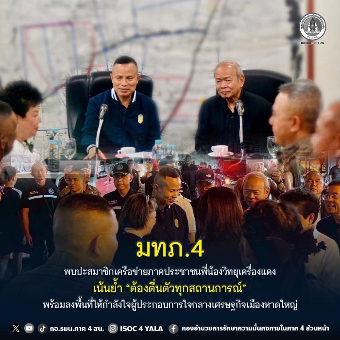 วันที่ 14 พฤศจิกายน เวลา 18:00 น. ที่ศูนย์วิทยุเครื่องแดงเพื่อความมั่นคง “ศูนย์มณโฑ” เครือข่ายเฝ้าระวังภาคประชาชน สถานีสารวัตรทหาร มณฑลทหารบกที่ 42 ค่ายเสนาณรงค์ อำเภอหาดใหญ่ จังหวัดสงขลา พลโท นรธิป โพยนอก แม่ทัพภาคที่ 4/ผู้อำนวยการรักษาความมั่นคงภายในภาค 4 พร้อมด้วยพลเอก พิเชษฐ์ วิสัยจร อดีตผู้ช่วยผู้บัญชาการทหารบก /อดีตแม่ทัพภาคที่ 4 เดินทางลงพื้นที่ พบปะพูดคุยกับกลุ่มสมาชิกเครือข่ายภาคประชาชนพี่น้องวิทยุเครื่องแดง (ศูนย์มณโฑ) เพื่อหารือแนวทางและมอบนโยบายการทำงาน เสริมสร้างประสิทธิภาพในการปฏิบัติภารกิจของเครือข่าย พร้อมรับฟังปัญหาข้อขัดข้องเพื่อนำมาปรับปรุงแก้ไขให้เหมาะสมเกิดประโยชน์ต่อกลุ่มสมาชิก และพี่น้องประชาชนโดยส่วนรวม โดยมี พันเอก ธนุตม์ พิศาลสิทธิวัฒน์ รองผู้บัญชาการมณฑลทหารบกที่ 42/ผู้บังคับหน่วยปฏิบัติการพิเศษร่วม พันเอก วาทยุทธ ชูช่วย รองผู้บัญชาการมณฑลทหารบกที่ 42 / รองผู้อำนวยการรักษาความมั่นคงภายในจังหวัดสงขลา (ฝ่ายทหาร) พันตำรวจเอก ภาคิน ณ ระนอง รองผู้บังคับการภูธรจังหวัดสงขลา พันเอกปริวิทย์ สุทธิโมกข์ เสนาธิการมณฑลทหารบกที่ 42 พันเอก กุดั่น ทองคำ รองเสนาธิการมณฑลทหารบกที่ 42 และคุณบงกช กาญจนแก้ว ประธานคณะกรรมการศูนย์วิทยุเครื่องแดงเพื่อความมั่นคง ตลอดจนส่วนที่เกี่ยวข้องร่วมให้การต้อนรับ