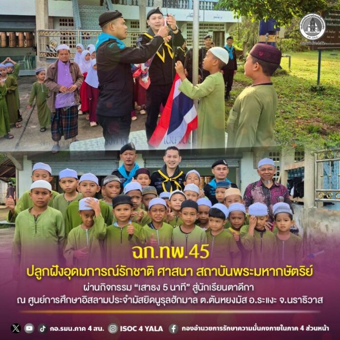 วันที่ 15 พฤศจิกายน 2568 เวลา 08.00 น. หน่วยเฉพาะกิจกรมทหารพรานที่ 45 โดย ชุดปฏิบัติการกิจการพลเรือน กองร้อยทหารพรานที่ 4514 ลงพื้นที่พบปะพัฒนาสัมพันธ์กับคณะครูและนักเรียนโรงเรียนตาดีกา ณ ศูนย์การศึกษาอิสลามประจำมัสยิดนูรุลฮักมาล หมู่ที่ 11 บ้านบูแก๊ะบูแย ตำบลตันหยงมัส อำเภอระแงะ จังหวัดนราธิวาส และได้ดำเนินกิจกรรมประกอบด้วย