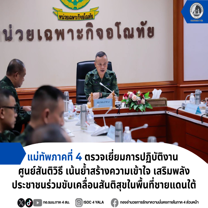 การตรวจเยี่ยมครั้งนี้สะท้อนความมุ่งมั่นของกองอำนวยการรักษาความมั่นคงภายในภาค 4 ส่วนหน้าในการผลักดันงานสันติวิธีบนพื้นฐานการมีส่วนร่วมของประชาชน เพื่อเดินหน้าสร้างสันติสุขอย่างยั่งยืนในพื้นที่จังหวัดชายแดนภาคใต้ต่อไป