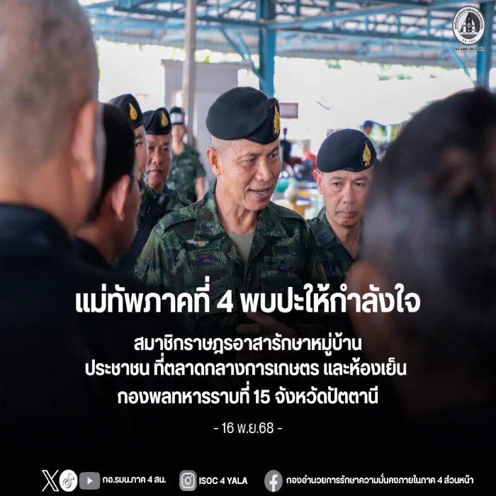 วันที่ 16 พฤศจิกายน 2568 เวลา 12.00 น. พลโท นรธิป โพยนอก แม่ทัพภาคที่ 4 / ผู้อำนวยการรักษาความมั่นคงภายในภาค 4 พร้อมผู้บังคับบัญชาของกองอำนวยการรักษาความมั่นคงภายในภาค 4 ส่วนหน้า ลงพื้นที่ตลาดกลางการเกษตรและห้องเย็น กองพลทหารราบที่ 15 (ค่ายสมเด็จพระสุริโยทัย) ตำบลบ่อทอง อำเภอหนองจิก จังหวัดปัตตานี เข้าพบปะให้กำลังใจสมาชิกราษฎรอาสารักษาหมู่บ้าน (อรบ.) และประชาชน เพื่อเดินหน้าส่งเสริมอาชีพ ยกระดับรายได้ประชาชน ผ่านโครงการฟาร์มตัวอย่างตามพระราชดำริในพื้นที่จังหวัดชายเเดนภาคใต้