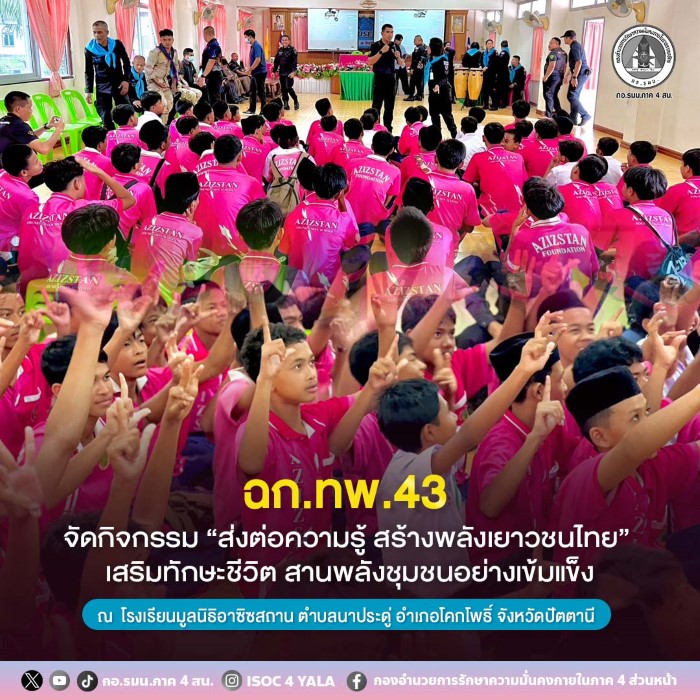 วันที่ 18 พฤศจิกายน 2568 เวลา 13.00 น. ณ โรงเรียนมูลนิธิอาซิซสถาน ตำบลนาประดู่ อำเภอโคกโพธิ์ จังหวัดปัตตานี พันเอก ชาญฤทธิ์ ฮันสราช ผู้บังคับหน่วยเฉพาะกิจกรมทหารพรานที่ 43 เป็นประธานเปิดกิจกรรม “ส่งต่อความรู้ สร้างพลังเยาวชนไทย” ซึ่งมุ่งส่งเสริมคุณภาพชีวิตของเยาวชนในพื้นที่ ผ่านการใช้เวลาว่างให้เกิดประโยชน์อย่างสร้างสรรค์กิจกรรมดังกล่าวครอบคลุมการพัฒนาทั้งด้านร่างกาย จิตใจ อารมณ์ และสังคม เพื่อสร้างความสุข ลดความเครียด เสริมทักษะและศักยภาพของเยาวชน ควบคู่กับการสร้างความสัมพันธ์อันดีในชุมชน และปลูกฝังการเป็นพลเมืองดี อีกทั้งยังเป็นส่วนหนึ่งในการป้องกันปัญหายาเสพติดในกลุ่มเยาวชน