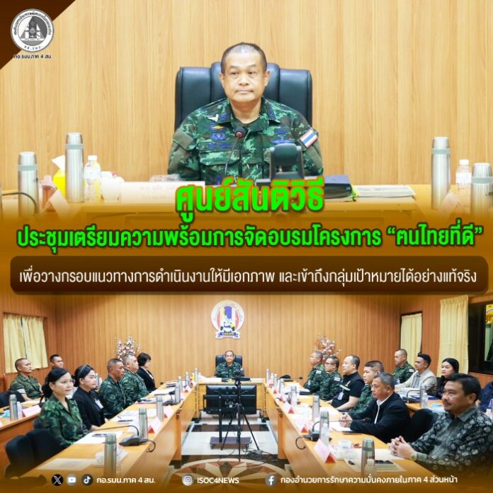 วันที่ 19 พฤศจิกายน 2568 เวลา 10.00 น. ที่ห้องประชุมศูนย์สันติวิธี (บ้านกรงนก) กองอำนวยการรักษาความมั่นคงภายในภาค 4 ส่วนหน้า ค่ายสิรินธร ต.เขาตูม อ.ยะรัง จ.ปัตตานี พันเอก อุทัย รุ่งสังข์ รองผู้อำนวยการศูนย์สันติวิธี เป็นประธานการประชุมเตรียมความพร้อม การจัดอบรมโครงการ “ฅนไทยที่ดี” เพื่อวางกรอบแนวทางการดำเนินงานให้มีเอกภาพ และให้ทุกหน่วยที่เกี่ยวข้องเข้าใจเป้าหมายร่วมกันอย่างชัดเจน ทั้งในมิติการเสริมสร้างความมั่นคง การพัฒนาทรัพยากรมนุษย์ และสร้างการมีส่วนร่วมในพื้นที่จังหวัดชายแดนภาคใต้
