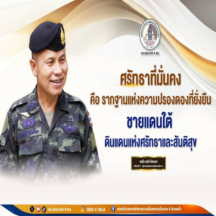ประชาสัมพันธ์ข่าวประชาสัมพันธ์ พลโท นรธิป โพยนอก แม่ทัพภาคที่ 4 / ผู้อำนวยการรักษาความมั่นคงภายในภาค 4 November 21, 2025 31 Share Facebook Twitter Google+ Telegram LINE สนันสนุน อิจติมะฮ์ โลก 2568 Markaz Dahwah Tabligh Thailand Masjid Al – Nur Yala 1447 “ดะวะห์รวมใจ สร้างสายใยสันติสุข สู่ชายแดนใต้ที่งดงาม” ชายแดนใต้ : ดินแดนแห่งศรัทธาและสันติสุข . แม่ทัพภาคที่ 4 กองอำนวยการรักษาความมั่นคงภายในภาค 4 ส่วนหน้า