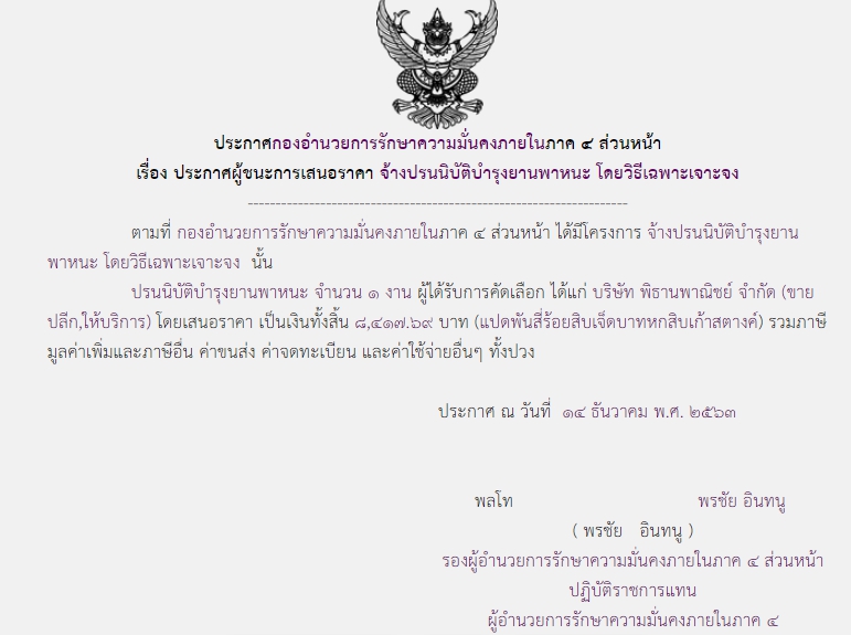 ประกาศผู้ชนะการเสนอราคา จ้างปรนนิบัติบำรุงยานพาหนะ โดยวิธีเฉพาะเจาะจง (8,417.69)