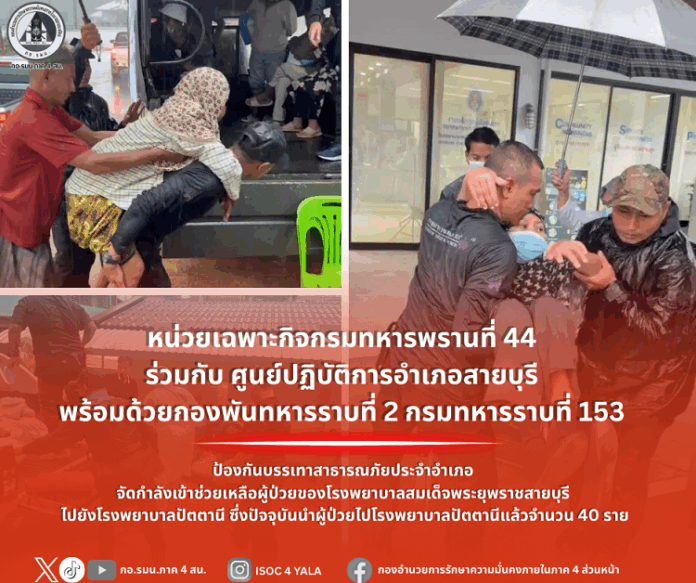 หน่วยเฉพาะกิจกรมทหารพรานที่ 44 ร่วมกับ ศูนย์ปฏิบัติการอำเภอสายบุรี พร้อมด้วยกองพันทหารราบที่ 2 กรมทหารราบที่ 153 ป้องกันบรรเทาสาธารณภัยประจำอำเภอ จัดกำลังพลและยานพาหนะเข้าดำเนินการช่วยเหลือประชาชน โดยเฉพาะผู้ป่วยจากโรงพยาบาลสายบุรี ซึ่งได้รับผลกระทบจากสถานการณ์ในพื้นที่ เพื่ออำนวยความสะดวกในการเคลื่อนย้ายไปยังโรงพยาบาลปัตตานี