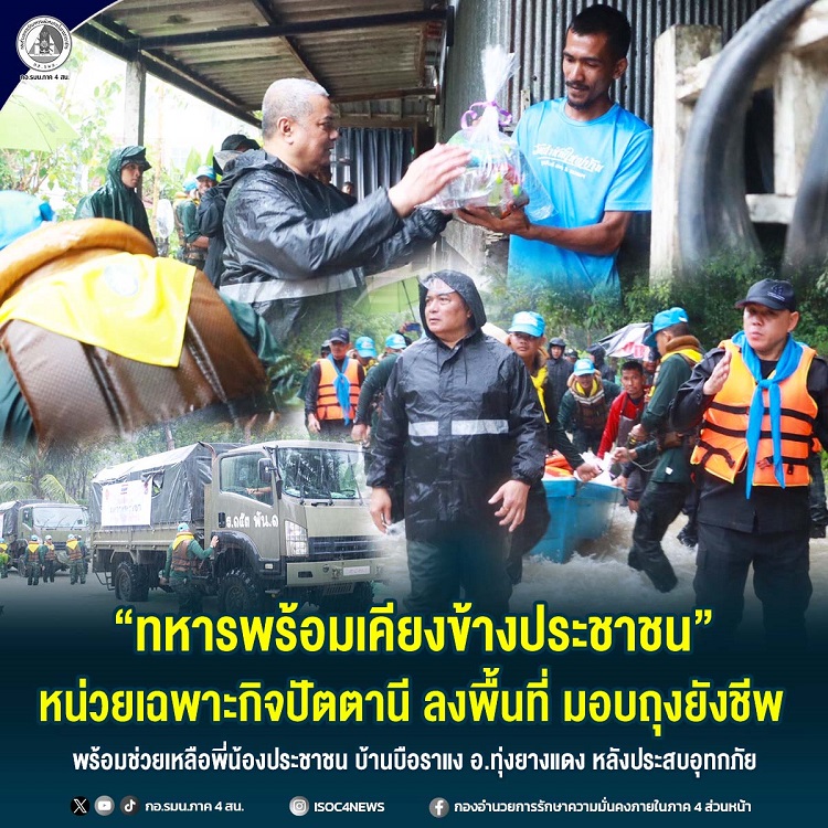 วันนี้ (22 พฤศจิกายน 2568) พันเอก รุ่งโรจน์ อนันตโท รองผู้บังคับหน่วยเฉพาะกิจปัตตานี ได้นำกำลังพลจิตอาสาลงพื้นที่ บ้านบือราแง หมู่ที่ 2 ตำบลน้ำดำ อำเภอทุ่งยางแดง จังหวัดปัตตานี พร้อมมอบถุงยังชีพจำนวน 40 ชุด ให้กับพี่น้องประชาชนที่ได้รับผลกระทบจากเหตุอุทกภัย เพื่อบรรเทาความเดือดร้อนในเบื้องต้น นอกจากนี้ยังได้ติดตามสถานการณ์น้ำในพื้นที่อย่างใกล้ชิด เพื่อประกอบการวางแผนและเตรียมความพร้อมในการดูแลช่วยเหลือพี่น้องประชาชนที่อาจได้รับผลกระทบเพิ่มเติมต่อไป