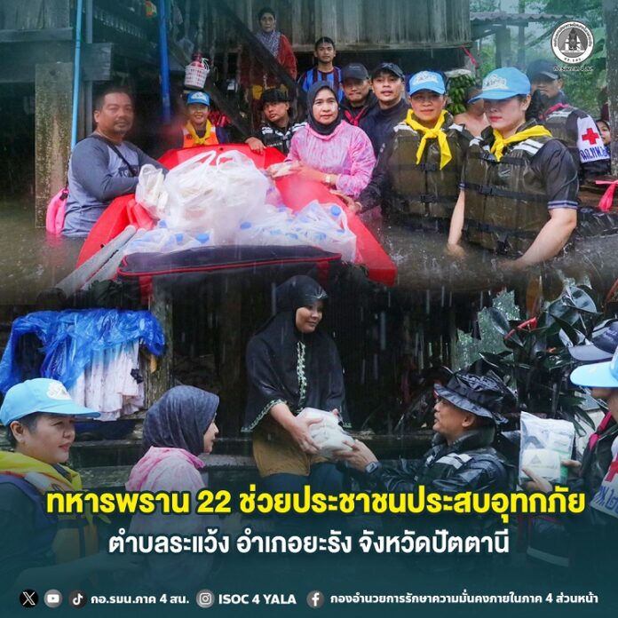 พันเอก อุเทน จีนทองหลาง ผู้บังคับหน่วยเฉพาะกิจกรมทหารพราน 22 พร้อมด้วยเจ้าหน้าที่ส่วนราชการและกำลังพลจิตอาสา ลงพื้นที่เยี่ยมประชาชนที่ประสบอุทกภัยในพื้นที่ ตำบลระแว้ง อำเภอยะรัง จังหวัดปัตตานี เพื่อให้ความช่วยเหลือและบรรเทาความเดือดร้อนในเบื้องต้น