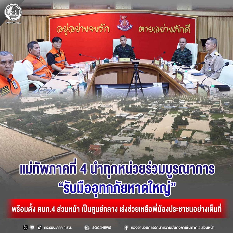 วันนี้ (24 พฤศจิกายน 2568) ที่ ห้องประชุม กองบัญชาการมณฑลทหารบกที่ 42 พลโท นรธิป โพยนอก แม่ทัพภาคที่ 4 / ผู้อำนวยการรักษาความมั่นคงภายในภาค 4 พร้อมด้วยทุกภาคส่วนที่เกี่ยวข้อง ประชุมเพื่อติดตามสถานการณ์น้ำท่วมที่เกิดขึ้นอย่างต่อเนื่อง พร้อมเร่งช่วยเหลือและอพยพพี่น้องประชาชนในพื้นที่เสี่ยงไปยังศูน์พักพิงที่ปลอดภัย