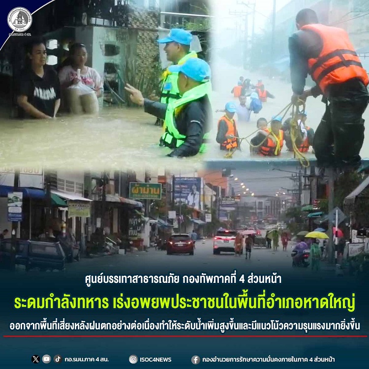 วันนี้ (24 พฤศจิกายน 2568) เวลา 10.30 น. ศูนย์บรรเทาสาธารณภัย กองทัพภาคที่ 4 ส่วนหน้า (มณฑลทหารบกที่ 42) ค่ายเสนาณรงค์ อำเภอหาดใหญ่ จังหวัดสงขลา พันเอก ธนุตน์ พิศาลสิทธิวัฒน์ รองผู้บัญชาการมณฑลทหารบกที่ 42 พร้อมนำกำลังพลเข้าให้การช่วยเหลือพี่น้องประชาชนในพื้นที่อำเภอหาดใหญ่ อย่างต่อเนื่อง หลังสถานการณ์อุทกภัยยังไม่คลี่คลาย และมีแนวโน้มความรุนแรงมากยิ่งขึ้น จากปริมาณฝนที่ตกสะสมตลอดทั้งคืน ส่งผลให้ระดับน้ำเพิ่มสูงขึ้นอย่างรวดเร็วในหลายพื้นที่