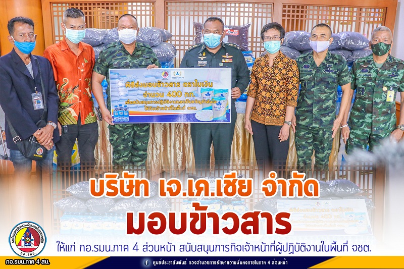 โดยบริษัท เจ.เค.เชีย จำกัด ได้รับทราบถึงการปฏิบัติงานของ กองอำนายการรักษาความมั่นคงภายในภาค 4 ส่วนหน้า ว่ามีภารกิจหลักในงานด้านการป้องกันและแก้ไขปัญหาความรุนแรงในพื้นที่จังหวัดชายแดนภาคใต้ เจ้าหน้าที่ทุกนายปฏิบัติหน้าที่ด้วยความอดทน กล้าหาญ เสียสละ เพื่อดูแลรักษาความสงบเรียบร้อยให้ประเทศชาติ ส่งผลให้ในปัจจุบัน มีผู้ก่อเหตุรุนแรงลดน้อยลง ทำให้พี่น้องประชาชนสามารถอยู่อาศัยในพื้นที่ด้วยความปลอดภัย สงบสุขมากขึ้นตามลำดับ บริษัท เจ.เค.เชีย จำกัด มีความซาบซึ้งใจต่อความเสียสละของเจ้าหน้าที่ผู้ปฏิบัติหน้าที่ในพื้นที่จังหวัดชายแดนภาคใต้ ซึ่งทำคุณประโยชน์ให้ประเทศชาติเป็นอย่างยิ่ง จึงได้มอบข้าวสารและเครื่องอุปโภคบริโภคเพื่อเป็นกำลังใจและแทนคำขอบคุณมา ณ โอกาสนี้