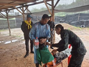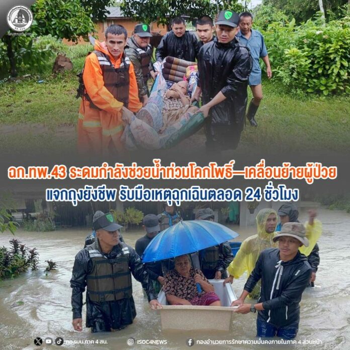ขณะเดียวกัน กองร้อยทหารพรานที่ 4302 หน่วยเฉพาะกิจกรมทหารพรานที่ 43 ร่วมกับหน่วยงาน 3 ฝ่ายในพื้นที่ตำบลป่าบอน ได้ออกแจกจ่ายสิ่งของจำเป็น ทั้งอาหารแห้ง น้ำดื่ม และของใช้ประจำวันให้กับประชาชนที่ถูกตัดขาดจากเส้นทางบางส่วนจากระดับน้ำที่เพิ่มขึ้น ช่วยบรรเทาความเดือดร้อนเบื้องต้น นอกจากนี้ หน่วยยังเร่งเข้าช่วยเหลือด้านดูแลสุขภาพ โดย กองร้อยทหารพรานที่ 4315 หน่วยเฉพาะกิจกรมทหารพรานที่ 43 ได้ร่วมกับกองร้อยทหารช่างสนามที่ 3 สังกัดกองพันทหารช่างที่ 15 กองพลทหารราบที่ 15 เข้าช่วยเหลือเด็กหญิงเมธาวี ทองมาตร ซึ่งถูกสัตว์มีพิษ (ตะขาบ) กัดระหว่างสถานการณ์น้ำท่วม และรีบนำส่งห้องฉุกเฉินโรงพยาบาลโคกโพธิ์อย่างปลอดภัย ขณะเดียวกัน กองร้อยทหารพรานที่ 4308 หน่วยเฉพาะกิจกรมทหารพรานที่ 43 ยังได้เข้าช่วยเหลือผู้ประสบอุบัติเหตุรถกระบะตกลงข้างทางในพื้นที่ตำบลท่าเรือ ซึ่งได้รับผลกระทบจากถนนลื่นและทัศนวิสัยไม่ดีเนื่องจากฝนตกต่อเนื่อง