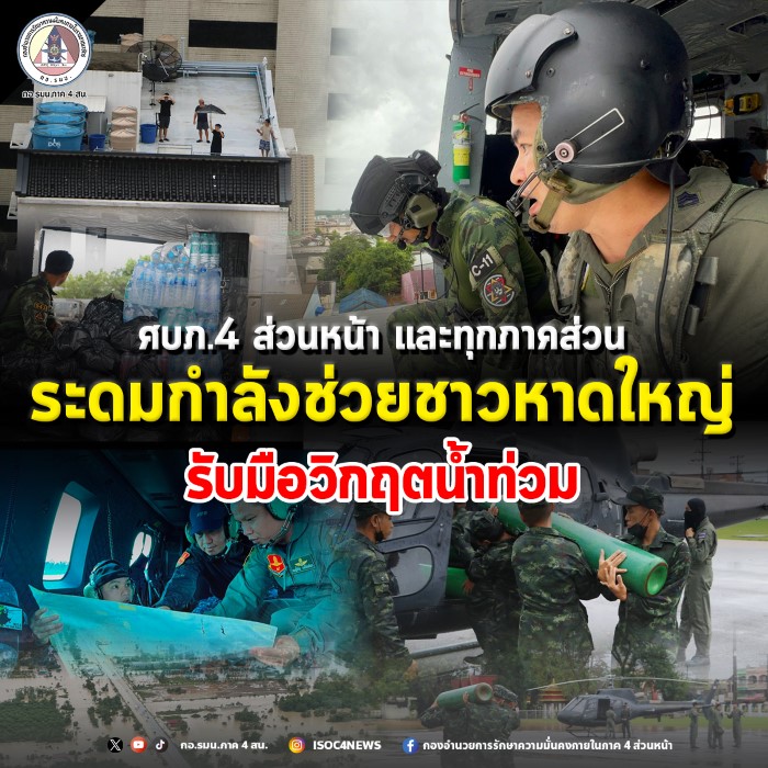 วันที่ 26 พฤศจิกายน 2568 เวลา 08.00 น. ที่ศูนย์บรรเทาสาธารณภัยกองทัพภาคที่ 4 ส่วนหน้า ค่ายเสนาณรงค์ อำเภอหาดใหญ่ จังหวัดสงขลา เจ้าหน้าที่ทุกภาคส่วนยังคงเร่งดำเนินการติดตามสถานการณ์และให้ความช่วยเหลือพี่น้องประชาชนในทุกมิติ ไม่ว่าจะเป็นการเคลื่อนย้ายผู้ป่วยวิกฤติ การสนับสนุนเฮลิคอปเตอร์จัดส่งถังออกซิเจนให้โรงพยาบาลหาดใหญ่ การจัดทำอาหารโดยโรงครัวพระราชทาน การเปิดพื้นที่ศูนย์พักพิง ตลอดจนการประสานอพยพพี่น้องประชาชนไปยังพื้นที่ปลอดภัยอย่างเร่งด่วน
