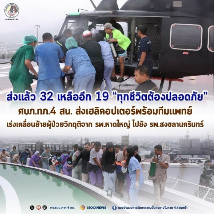 วันนี้ 26 พฤศจิกายน 2568 ศูนย์บรรเทาสาธารณภัยภาคที่ 4 ส่วนหน้า ได้จัดส่งเฮลิคอปเตอร์พร้อมทีมแพทย์ เข้าดำเนินการลำเลียงผู้ป่วยวิกฤติ ไปยังโรงพยาบาลสงขลานครินทร์ เพื่อให้ได้รับการรักษาอย่างต่อเนื่อง ซึ่งโรงพยาบาลหาดใหญ่ได้รับผลกระทบจากอุทกภัยระดับรุนแรง น้ำท่วมสูงจนกระทบต่อระบบผลิตไฟฟ้าและระบบสาธารณูปโภคภายในโรงพยาบาล ส่งผลให้ไม่สามารถดูแลผู้ป่วยได้ตามปกติ จึงต้องเร่งเคลื่อนย้ายผู้ป่วยไปยังโรงพยาบาลที่มีความพร้อมทันที