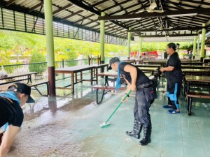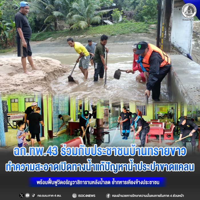 โดยกำลังพลและชาวบ้านได้ร่วมแรงร่วมใจกันดำเนินการขุดลอกและนำเศษไม้ ทราย รวมถึงสิ่งกีดขวางต่างๆ ออกจากบริเวณท่อส่งน้ำจนสำเร็จ สามารถเปิดทางน้ำและฟื้นฟูระบบประปาให้กลับมาใช้งานได้ตามปกติ หลังเสร็จสิ้นภารกิจ ประชาชนในพื้นที่ต่างแสดงความขอบคุณต่อเจ้าหน้าที่ทหารและทุกฝ่ายที่เข้ามาช่วยเหลือแก้ไขปัญหาได้อย่างรวดเร็ว ทำให้ความสัมพันธ์อันดีระหว่างหน่วยงานรัฐและมวลชนในพื้นที่แน่นแฟ้นยิ่งขึ้น นอกจากนี้ หน่วยเฉพาะกิจกรมทหารพรานที่ 43 ร่วมกับผู้นำท้องถิ่นและประชาชนจิตอาสาลงพื้นที่ช่วยเหลือฟื้นฟู ปรับภูมิทัศน์ ภายหลังจากที่สถานการณ์อุทกภัยในพื้นที่เริ่มคลี่คลายโดยร่วมกันดำเนินการทำความสะอาด ฉีดล้างดินโคลนที่ถูกน้ำพัดมาทับถม และขนย้ายสิ่งของภายในบริเวณวัดอรัญวาสิการาม (วัดห้วยเงาะ) หมู่ที่ 4 ตำบลทุ่งพลา อำเภอโคกโพธิ์ จังหวัดปัตตานี เพื่อบรรเทาความเดือดร้อนของพระภิกษุสงฆ์และประชาชนในเบื้องต้น รวมถึงให้สถานที่สำคัญทางศาสนาสามารถกลับมาประกอบศาสนพิธีทางศาสนาได้ตามปกติโดยเร็วที่สุด ประชาชนในพื้นที่ต่างรู้สึกซาบซึ้งและกล่าวขอบคุณกำลังพลและทุกภาคส่วนที่เข้ามาช่วยเหลือดูแลอย่างใกล้ชิด ทั้งในยามเกิดภัยพิบัติและในภารกิจฟื้นฟูพื้นที่หลังน้ำลด ซึ่งเป็นการตอกย้ำถึงความพร้อมของเจ้าหน้าที่ในการเป็นที่พึ่งให้กับประชาชนในทุกโอกาส