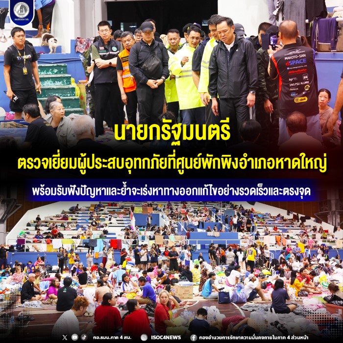 วันนี้ (26 พฤศจิกายน 2568) เวลา 19.00 น. นายอนุทิน ชาญวีรกูล นายกรัฐมนตรี และรัฐมนตรีว่าการกระทรวงมหาดไทย และคณะ ลงพื้นที่ตรวจเยี่ยม ศูนย์พักพิงชั่วคราว โรงพยาบาลสงขลานครินทร์ (มอ.หาดใหญ่) โดยออกเดินทางจาก ศูนย์บรรเทาสาธารณภัย กองทัพภาคที่ 4 ส่วนหน้า (มณฑลทหารบกที่ 42) ค่ายเสนาณรงค์ อำเภอหาดใหญ่ จังหวัดสงขลา ด้วยรถบรรทุกทหาร (FTS) เพื่อให้กำลังใจและสอบถามความทุกข์ยากของผู้ประสบอุทกภัย พร้อมสั่งบัญชาการทุกส่วนให้ช่วยเหลือผู้ประสบภัยที่ติดค้างอยู่ต่อไป