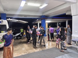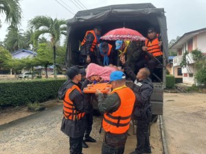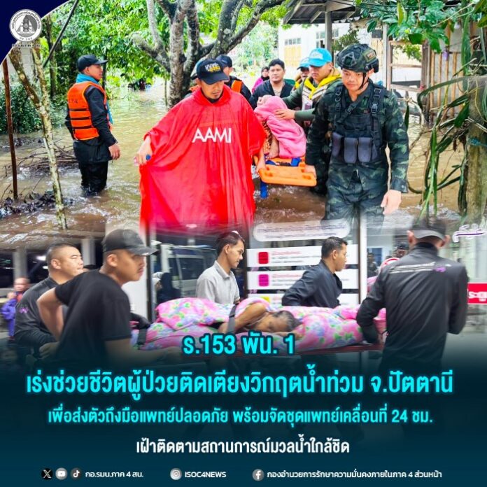 กำลังพลจากกองพันทหารราบที่ 1 กรมทหารราบที่ 153 (ร.153 พัน 1) ร่วมกับหน่วยเฉพาะกิจกรมทหารพรานที่ 44 ได้นำกำลังพลลงพื้นที่เข้าปฏิบัติภารกิจฉุกเฉินให้การช่วยเหลือผู้ป่วยติดเตียงที่ต้องการความช่วยเหลือทางการแพทย์อย่างเร่งด่วนในพื้นที่อำเภอกะพ้อ และอำเภอทุ่งยางแดง จังหวัดปัตตานี ในการดูแลประชาชนกลุ่มเปราะบางที่ประสบภัยน้ำท่วมมีอาการสาหัสในช่วงเวลากลางคืน ซึ่งจำเป็นต้องได้รับการดูแลจากแพทย์อย่างทันท่วงที โดยเจ้าหน้าที่เข้าเคลื่อนย้ายผู้ป่วยติดเตียงออกจากพื้นที่น้ำท่วมสูง และนำส่งตัวยังโรงพยาบาลส่งเสริมสุขภาพตำบลประจำพื้นที่ได้อย่างปลอดภัย พร้อมกันนี้ ทางหน่วยได้กำชับให้หน่วยงานที่รับผิดชอบใน 4 อำเภอ ได้แก่ อำเภอสายบุรี, อำเภอกะพ้อ, อำเภอทุ่งยางแดง และอำเภอไม้แก่น จังหวัดปัตตานี จัดเตรียมชุดแพทย์ประจำตำบลให้บริการเฝ้าระวัง และเตรียมพร้อมเข้าให้ความช่วยเหลือประชาชนอย่างเต็มกำลังความสามารถตลอด 24 ชั่วโมง เพื่อรับมือกับสถานการณ์น้ำท่วมที่ยังคงมีอยู่อย่างต่อเนื่อง
