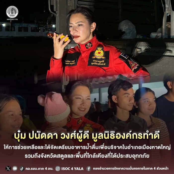 วันที่ (26 พฤศจิกายน 2568) เวลา 21.30 น. ที่ศูนย์บรรเทาสาธารณภัย กองทัพภาคที่ 4 ส่วนหน้า (มณฑลทหารบกที่ 42) ค่ายเสนาณรงค์ อำเภอหาดใหญ่ จังหวัดสงขลา คุณบุ๋ม ปนัดดา วงศ์ผู้ดี มูลนิธิองค์กรทำดี ได้เดินทางให้การช่วยเหลือและได้จัดเตรียมอาหารน้ำดื่มเพื่อบริจาคในอำเภอเมืองหาดใหญ่ รวมถึงจังหวัดสตูลและพื้นที่ใกล้เคียงที่ได้ประสบอุทกภัยในครั้งนี้