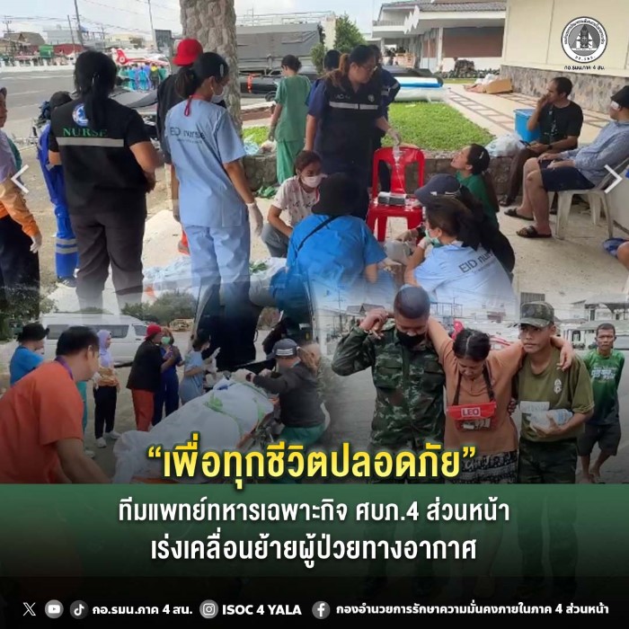 วันนี้ (27 พฤศจิกายน 2568) ที่ศูนย์บรรเทาสาธารณภัยกองทัพภาคที่ 4 ส่วนหน้า ทีมแพทย์ทหารเฉพาะกิจได้ปฏิบัติภารกิจตามแผนการเคลื่อนย้ายผู้ป่วยจากโรงพยาบาลหาดใหญ่ ไปยังโรงพยาบาลปลายทาง เพื่อให้ผู้ป่วยได้รับการรักษาอย่างต่อเนื่องและทันท่วงที