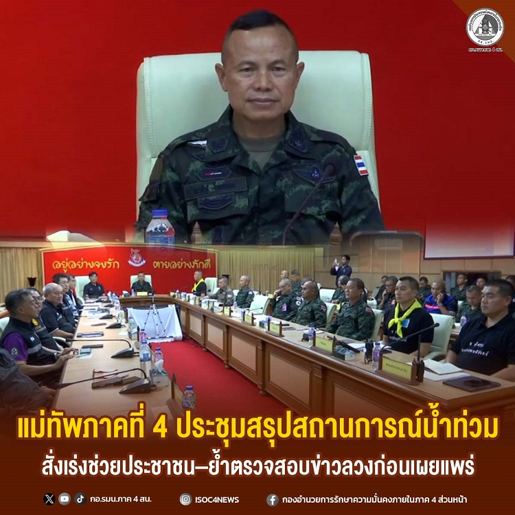 วันที่ 27 พฤศจิกายน 2568 เวลา 17.00 น. ที่ห้องประชุมเสนาณรงค์ กองบัญชาการมณฑลทหารบกที่ 42 ค่ายเสนาณรงค์ อำเภอหาดใหญ่ จังหวัดสงขลา พลโท นรธิป โพยนอก แม่ทัพภาคที่ 4 / ผู้อำนวยการรักษาความมั่นคงภายในภาค 4 ประชุมสรุปสถานการณ์อุทกภัยประจำวัน ร่วมกับผู้แทนทุกภาคส่วน เพื่อประเมินสภาพความเสียหายและปรับแผนการช่วยเหลือให้สอดคล้องกับสถานการณ์ที่ยังคงวิกฤตในหลายพื้นที่
