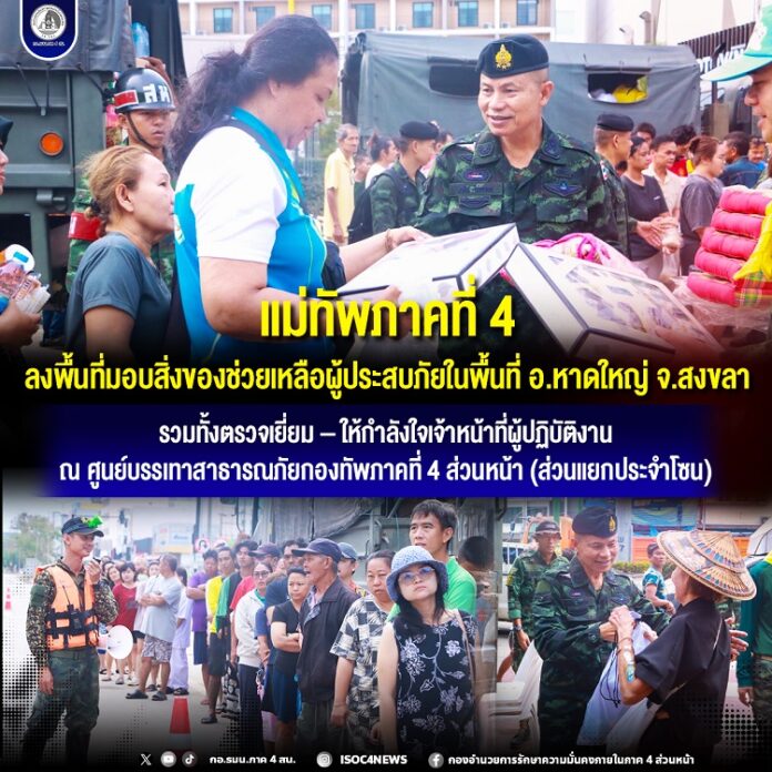 เมื่อวันที่ 28 พฤศจิกายน 2568 พลโท นรธิป โพยนอก แม่ทัพภาคที่ 4 ลงพื้นที่ตรวจเยี่ยมการปฏิบัติงานของเจ้าหน้าที่ ณ ศูนย์บรรเทาสาธารณภัยกองทัพภาคที่ 4 ส่วนหน้า (ส่วนแยกประจำโซน) และให้กำลังใจเจ้าหน้าที่ผู้ปฏิบัติงาน ย้ำการปฏิบัติอย่างเต็มกำลังในการช่วยเหลือประชาชนที่ได้รับผลกระทบจากสถานการณ์อุทกภัยในพื้นที่อำเภอหาดใหญ่ จังหวัดสงขลา ให้ทุกชีวิตมีความปลอดภัย