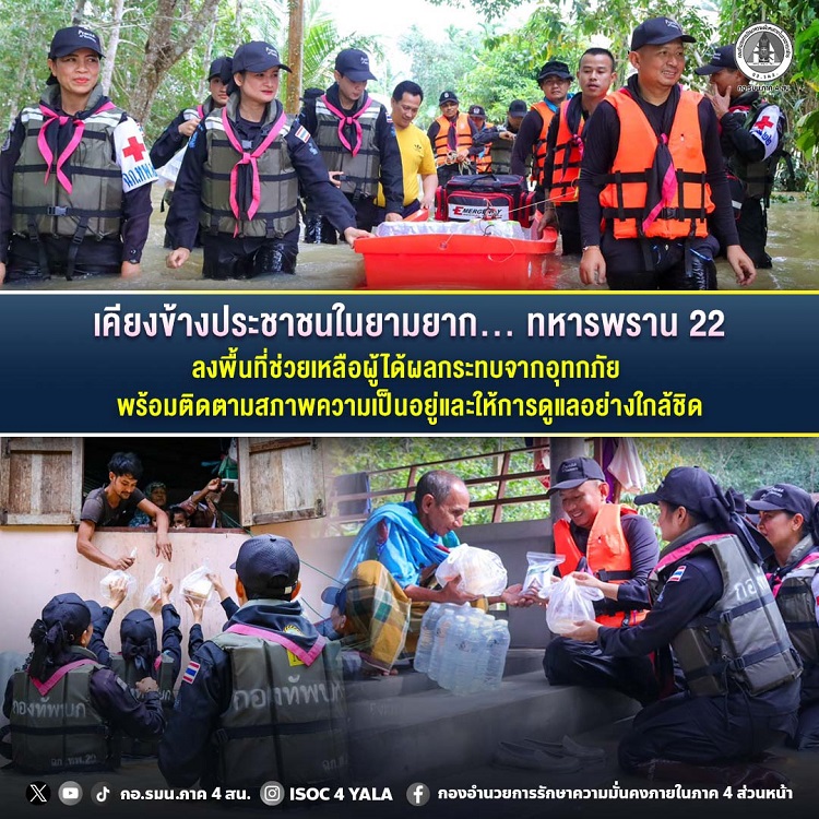 หลายพื้นที่ของจังหวัดปัตตานี ยังคงประสบภาวะน้ำท่วมต่อเนื่อง หน่วยทหารพรานกรมทหารพรานที่ 22 ได้เร่งช่วยเหลือประชาชนอย่างไม่หยุดยั้ง โดยมี พันเอก อุเทน จีนทองหลาง ผู้บังคับหน่วยเฉพาะกิจกรมทหารพรานที่ 22 นำกำลังพล หมวดทหารพรานหญิง , กองร้อยทหารพรานที่ 2204 และผู้นำชุมชน ลงพื้นที่หมู่ 1 ตำบลเมาะมาวี อำเภอยะรัง จังหวัดปัตตานี เพื่อเข้าช่วยเหลือพี่น้องประชาชนที่ได้รับผลกระทบจากอุทกภัยอย่างใกล้ชิด โดยเจ้าหน้าที่ได้สอบถามสภาพความเป็นอยู่ รวมถึงมอบถุงยังชีพ ยาเวชภัณฑ์ อาหารปรุงสุก และน้ำดื่ม เพื่อช่วยบรรเทาความเดือดร้อนเบื้องต้นให้กับพี่น้องประชาชนที่ยังคงติดอยู่ภายในพื้นที่น้ำท่วมขัง