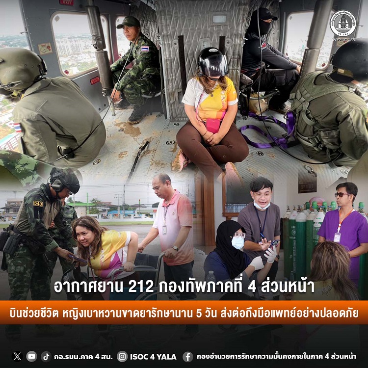 กำลังพลได้ใช้เฮลิคอปเตอร์ อากาศยาน 212 เข้าปฏิบัติการลำเลียงฉุกเฉินเพื่อช่วยชีวิต ผู้ป่วยหญิงรายหนึ่ง ซึ่งเป็นผู้ป่วยวิกฤตที่โดยพบว่าผู้ป่วยรายนี้เป็นโรคเบาหวาน และประสบปัญหาขาดแคลนยารักษาติดต่อกันมาเป็นเวลาถึง 5 วัน ซึ่งเป็นภาวะที่อันตราย จึงได้ลำเลียงผู้ป่วยออกมาได้อย่างปลอดภัย ก่อนจะนำตัวผู้ป่วยส่งต่อให้กับทีมแพทย์เพื่อทำการรักษาพยาบาลต่อทันทีที่ โรงพยาบาลค่ายเสนาณรงค์