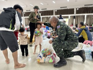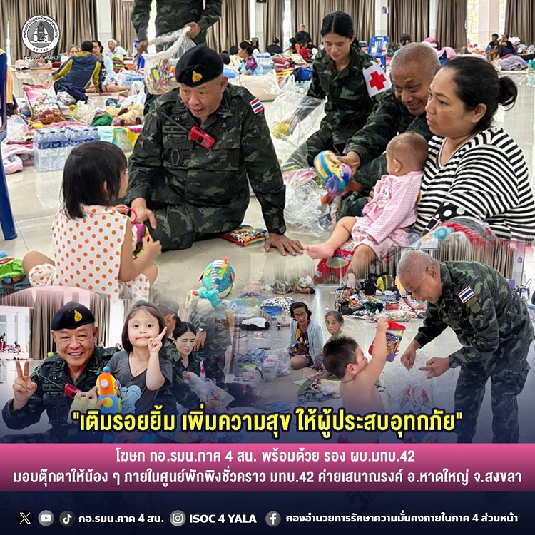 วันนี้ (28 พฤศจิกายน 2568) เวลา 12.30 น. ที่ ศูนย์พักพิงชั่วคราว มณฑลทหารบกที่ 42 ค่ายเสนาณรงค์ อำเภอหาดใหญ่ จังหวัดสงขลา พันเอก ยุทธนาม เพชรม่วง โฆษก กองอำนวยการรักษาความมั่นคงภายในภาค 4 ส่วนหน้า พร้อมด้วย พันเอก ธนุตม์ พิศาลสิทธิวัฒน์ รองบัญชาการมณฑลทหารบกที่ 42 ลงพื้นที่มอบของเล่นเด็ก และตุ๊กตาให้กับน้อง ๆ ภายในศูนย์ พักพิงชั่วคราวฯ เพื่อเติมรอยยิ้ม เพิ่มความสุขให้ผู้ประสบอุทกภัย