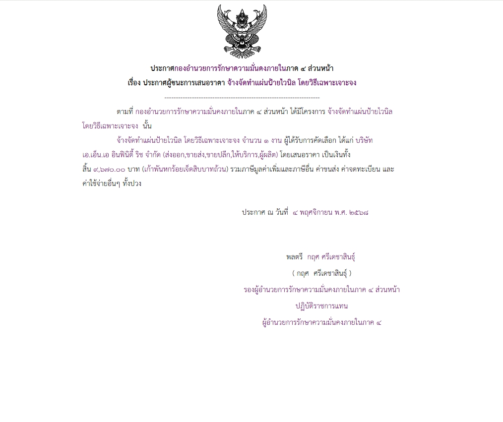 ประกาศผู้ชนะการเสนอราคา จ้างจัดทำแผ่นป้ายไวนิล โดยวิธีเฉพาะเจาะจง