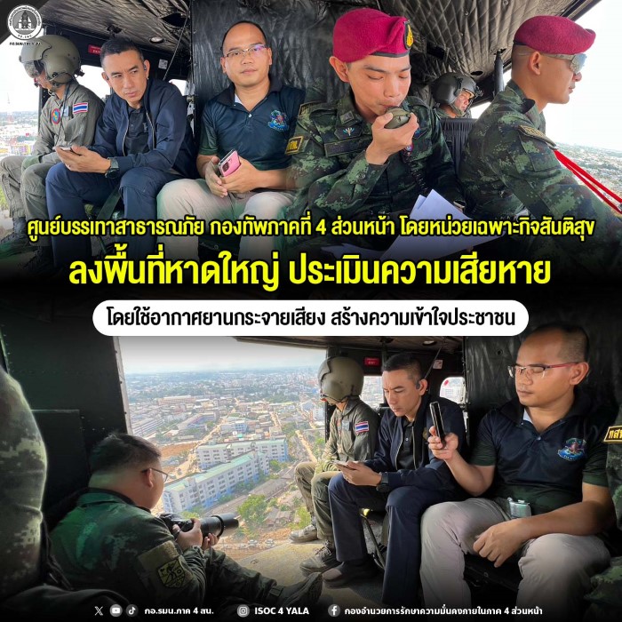 ต่อมา เวลา 17.20 น. รองผู้บังคับการตำรวจ พร้อมด้วย พลตรี สมคิด บุญโชติ เสนาธิการกองทัพภาคที่ 4 ได้บินสำรวจพื้นที่และดำเนินการประชาสัมพันธ์ร่วมกับหน่วยเฉพาะกิจสันติสุข เพื่อยืนยันความพร้อมของหน่วยงานรัฐในการช่วยเหลือประชาชน สร้างความเข้าใจในมาตรการฟื้นฟูพื้นที่ และอำนวยความสะดวกให้ประชาชนอย่างทั่วถึง เน้นย้ำความสำคัญของความร่วมมือระหว่างหน่วยงานรัฐและประชาชน พร้อมขอบคุณทุกความร่วมมือและความเข้าใจในการปฏิบัติงานของเจ้าหน้าที่ และยืนยันว่าหน่วยงานภาครัฐจะอยู่เคียงข้างประชาชนจนกว่าทุกอย่างจะกลับสู่สภาวะปกติ