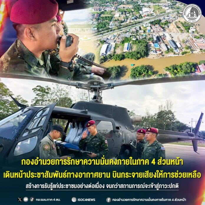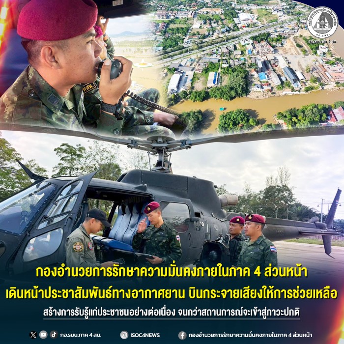 วันที่ 30 พฤศจิกายน 2568 พลตรี ชาคริต อุจะรัตน รองแม่ทัพภาคที่ 4 และรองผู้อำนวยการรักษาความมั่นคงภายในภาค 4 ส่วนหน้า สั่งการให้หน่วยบินทหารบกอโณทัย ร่วมกับ ชุดทักษิณสัมพันธ์ หน่วยเฉพาะกิจสันติสุข นำอากาศยานขึ้นบิน เพื่อปฎิบัติภารกิจบินสำรวจพื้นที่ และกระจายเสียงประชาสัมพันธ์ให้ประชาชนรับทราบสถานการณ์ ให้เตรียมพร้อมรับมือกับภัยพิบัติที่อาจเกิดขึ้น โดยกองอำนวยการรักษาความมั่นคงภายในภาค 4 ส่วนหน้า มีความห่วงใย ประชาชนในพื้นที่จังหวัดชายแดนภาคใต้ บินสำรวจเพื่อประเมินสภาพความเสียหายและประชาสัมพันธ์เสริมสร้างความเข้าใจแก่ประชาชนในพื้นที่ที่ประสบภัยพิบัติอย่างต่อเนื่องจนกว่าสถานการณ์จะเข้าสู่ ภาวะปกติ