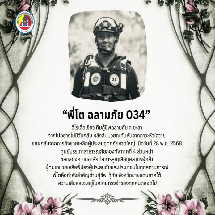 วันนี้ (30 พฤศจิกายน 2568) ศูนย์บรรเทาสาธารณภัยกองทัพภาคที่ 4 ส่วนหน้า ขอแสดงความเสียใจกับครอบครัวของ นายเชิดพงศ์ ปิยะวรรณางกูร หรือพี่โต ฉลามภัย 034 ฮีโร่เสื้อเขียว ทีมกู้ชีพฉลามภัย จังหวัดยะลา ซึ่งได้จากไปอย่างไม่วันกลับเมื่อช่วงเย็นวันนี้ หลังจากที่ล้มป่วยกระทันหันขณะเดินทางกลับจากช่วยเหลือพี่น้องประชาชนที่ประสบอุทกภัยในพื้นที่อำเภอหาดใหญ่ จังหวัดสงขลา โดยแพทย์วินิจฉัยว่าเกิดภาวะหัวใจวายเฉียบพลัน ต่อมาพี่โตได้อยู่ในการดูแลของทีมแพทย์อย่างใกล้ชิด จนถึงเมื่อช่วงบ่ายของวันนี้ พี่โต ฉลามภัย 034 ฮีโร่เสื้อเขียว ทีมกู้ชีพฉลามภัย จังหวัดยะลา ได้จากพวกเราไปอย่างไม่มีวันกลับ
